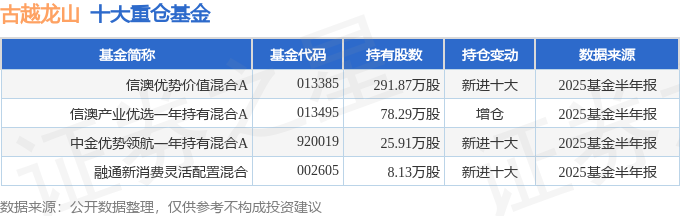 持有古越龙山最多的基金为信澳优势价值混合A,目前规模为6.78亿元,最新净值0.7889(8月29日),较上一交易日下跌0.11%,近一年上涨16.47%。该基金现任基金经理为李晓西。